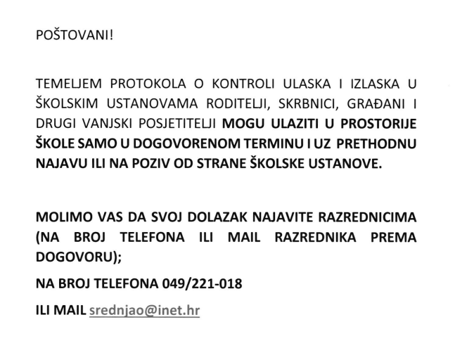 VAŽNA OBAVIJEST Protokol o kontroli ulaska i izlaska u školsku ustanovu