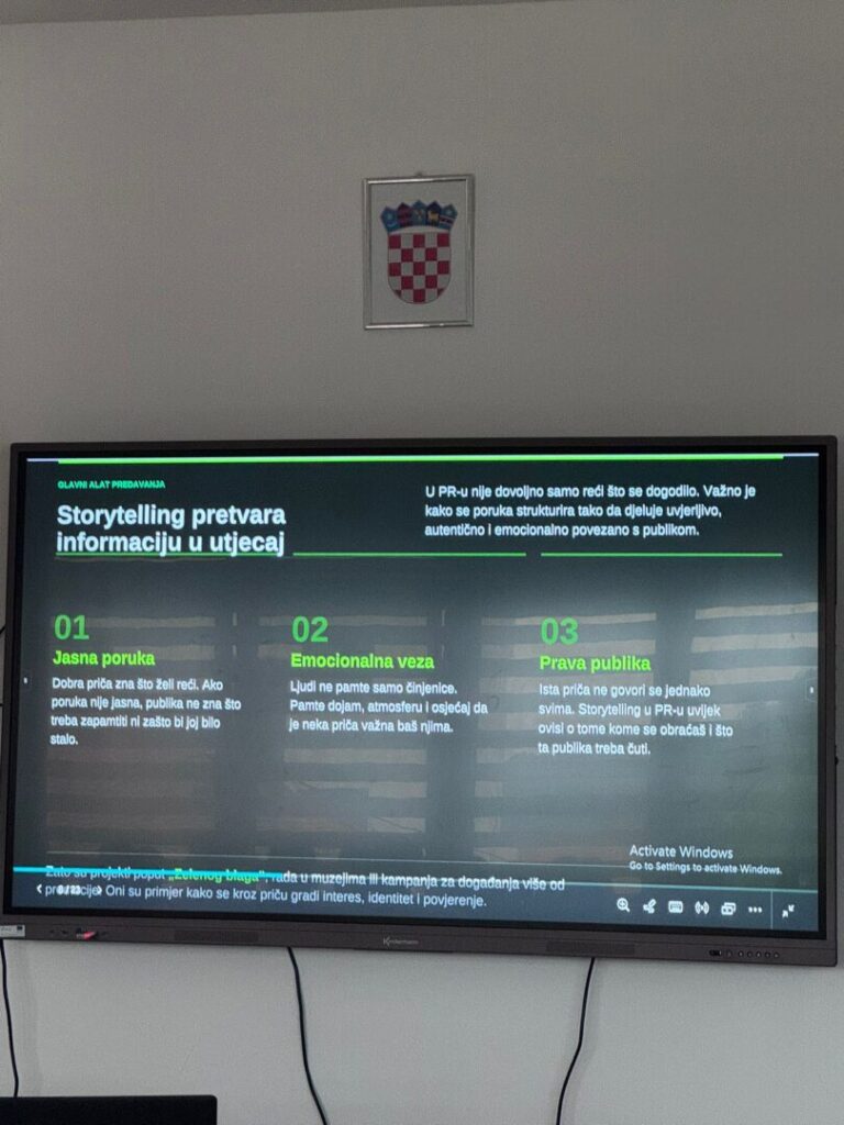 “Predavanje o PR-u koje je održao Sven Šems bilo mi je vrlo zanimljivo i korisno jer je teoriju povezao s konkretnim primjerima iz prakse. Posebno mi se svidjelo što je naglasio koliko je u odnosima s javnošću važno razumjeti ljude, a ne samo medije i kanale komunikacije. Predavanje mi je pomoglo shvatiti da dobar PR nije samo “uljepšavanje” stvarnosti, nego strateško i odgovorno komuniciranje koje gradi povjerenje. Najzanimljiviji trenutak za mene bio je kada je govorio o kriznoj komunikaciji i važnosti brzog, iskrenog reagiranja. Taj dio me se posebno dojmio jer pokazuje koliko jedna pogrešna ili zakašnjela izjava može utjecati na imidž osobe ili organizacije. Upravo taj primjer mi je ostao u sjećanju jer jasno pokazuje koliko PR ima veliku ulogu u stvarnim, često nepredvidivim situacijama.” B.V. 3.Ea
