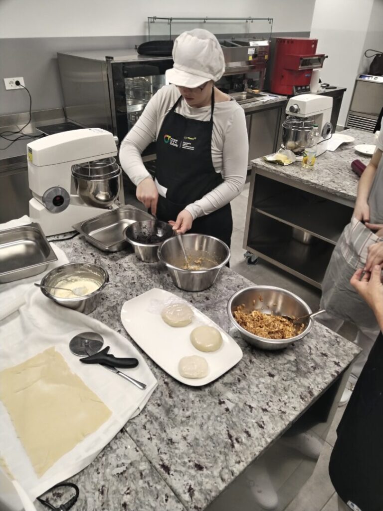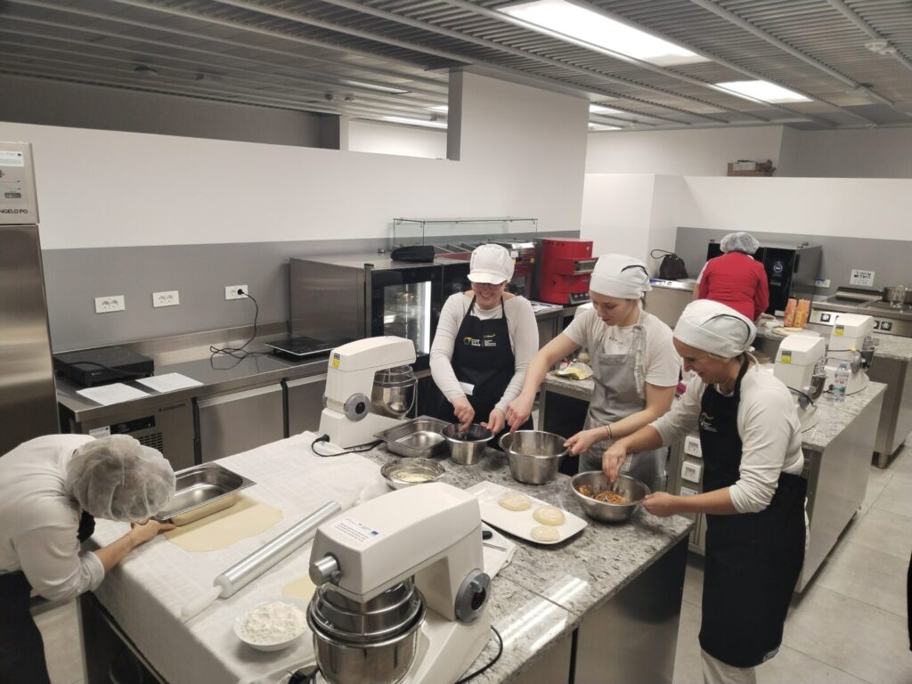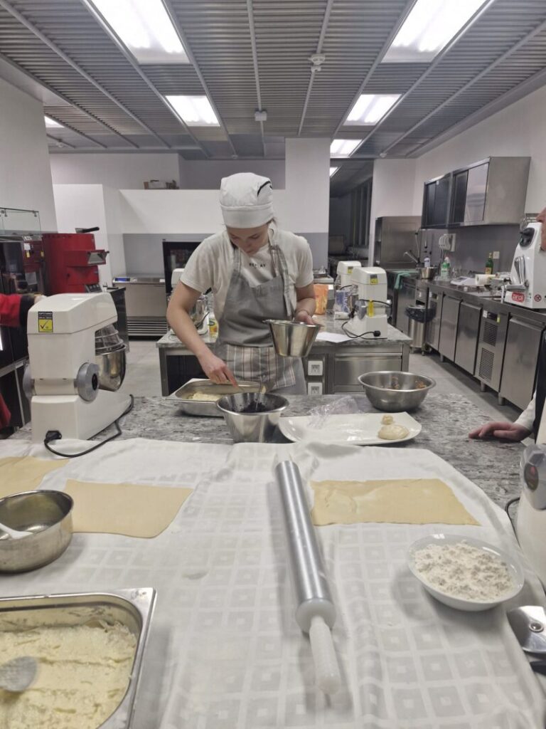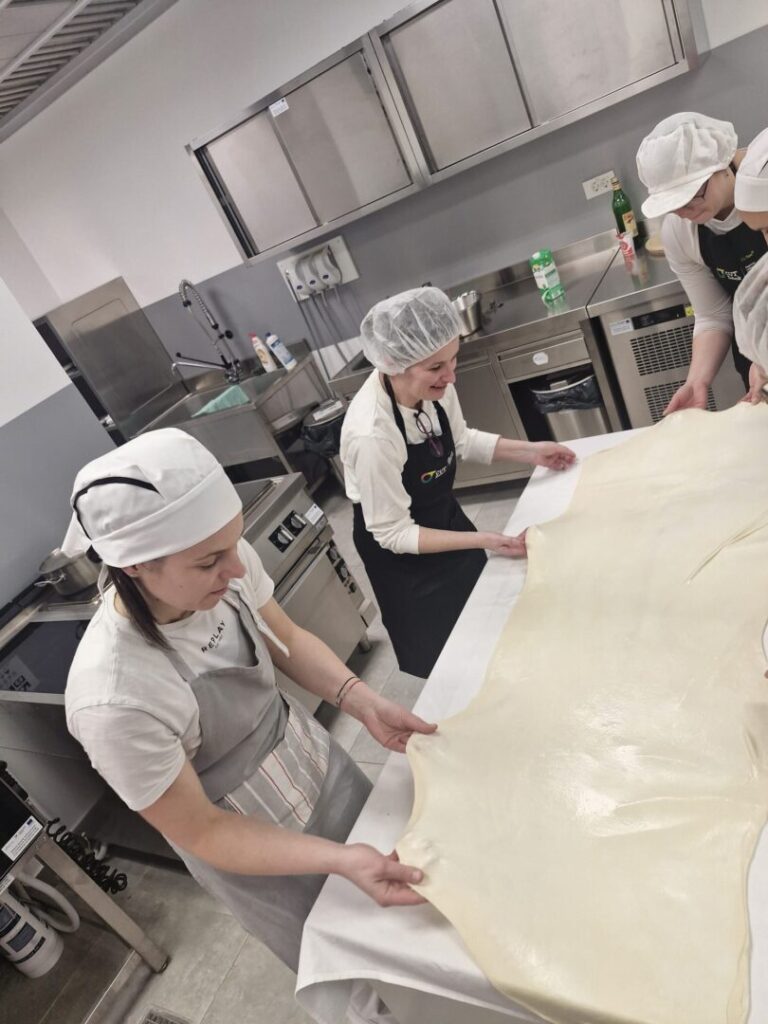 Nakon teorijskog dijela predavanja polaznice su s velikim oduševljenjem započele praktični rad u kabinetu slastičarstva. U sklopu modula Slastičarstvo naučile su osnove pripreme vučenog tijesta te se okušale u njegovoj izradi.
