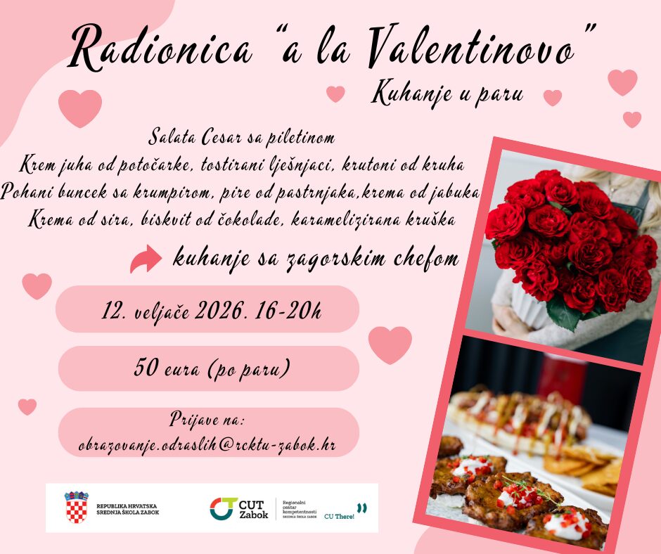 U sklopu programa obrazovanja odraslih povodom Valentinova organiziramo posebnu radionicu kuhanja namijenjenu parovima koji žele naučiti nešto novo, zabaviti se i uživati u vrhunskim okusima tradicionalne i moderne kuhinje, uz ugodnu atmosferu i stručno vodstvo.