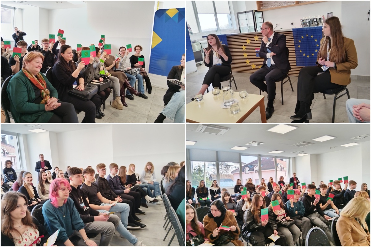 Dok je zastupnik bio u kratkom obilasku škole i Akademisa, u trening centru nije bilo dosadno već je Fran s gostujućim kolegama završnih razreda iz naših prijateljskih škola u okruženju, odradio digitalni kviz o našem gostu, zastupniku Stieru i  instituciji iz koje dolazi, EU parlamentu. Rezultati su bili iznimno zadovoljavajući, dapače, izvrsni, a troje najbržih, najtočnijih i najsretnijih dobilo je simbolične poklone. Ovom prigodom zahvaljujemo učenicima, nastavnicama te Ravnateljicama i Ravnatelju: Škole za umjetnost, dizajn, grafiku i odjeću Zabok, Gimnazije A. G. Matoša Zabok, Srednjoj školi Krapina, Srednjoj školi Oroslavje, Srednjoj školi Bedekovčina i našoj EPAS partner školi, Srednjoj školi Konjščina.